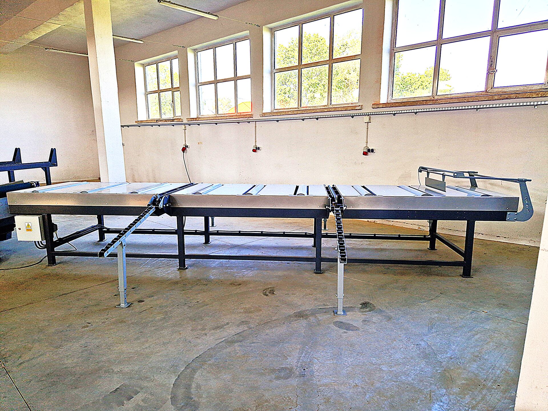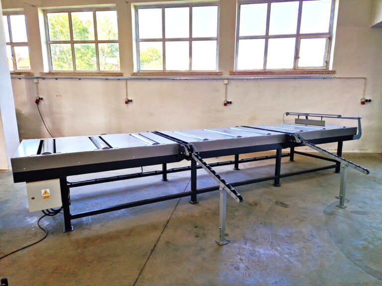 Maszyna odbiera materiał drzewny za pomocą elektrycznie napędzanych rolek transportowych, które zapewniają płynny i stabilny przesuw elementów drewnianych. System wyposażony jest w automatyczny detektor długości (zderzak), który po wykryciu końca elementu zatrzymuje napęd rolek i uruchamia łańcuchowy zrzut poprzeczny.