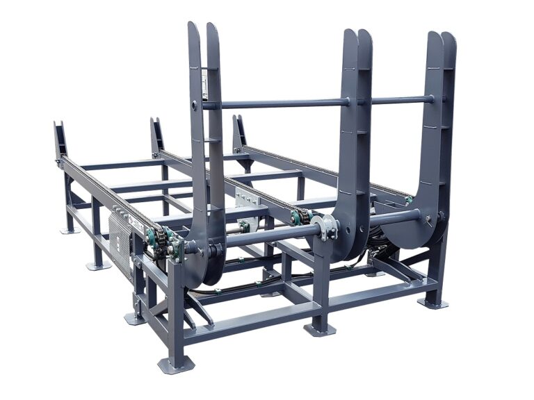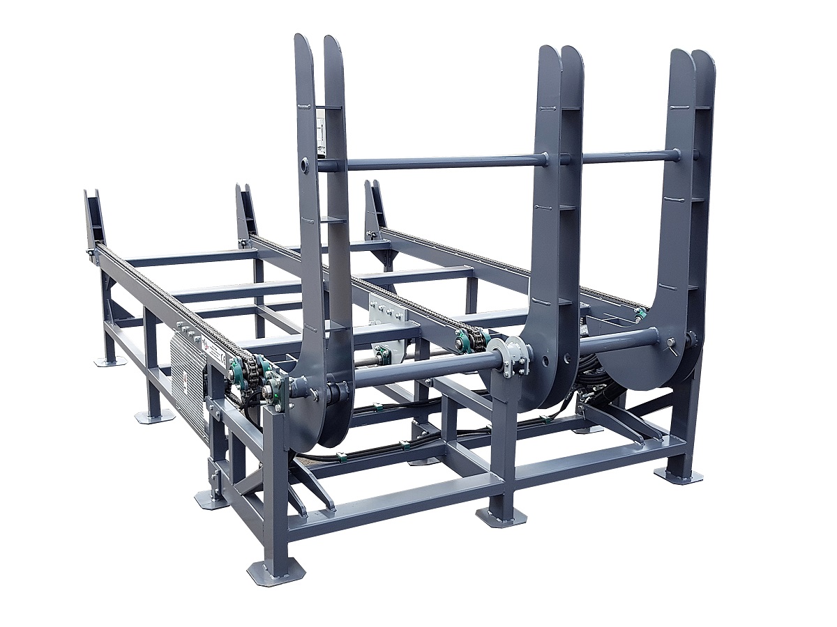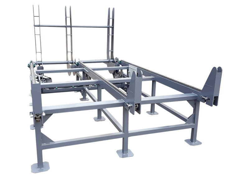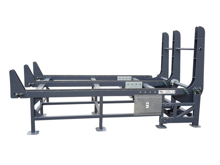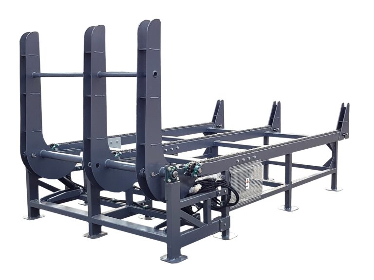 Hydrauliczny podajnik kłody z rozładunkiem grawitacyjnym to solidne i niezawodne rozwiązanie przeznaczone do współpracy z trakami taśmowymi, zapewniające płynne, bezpieczne i wydajne podawanie drewna.
