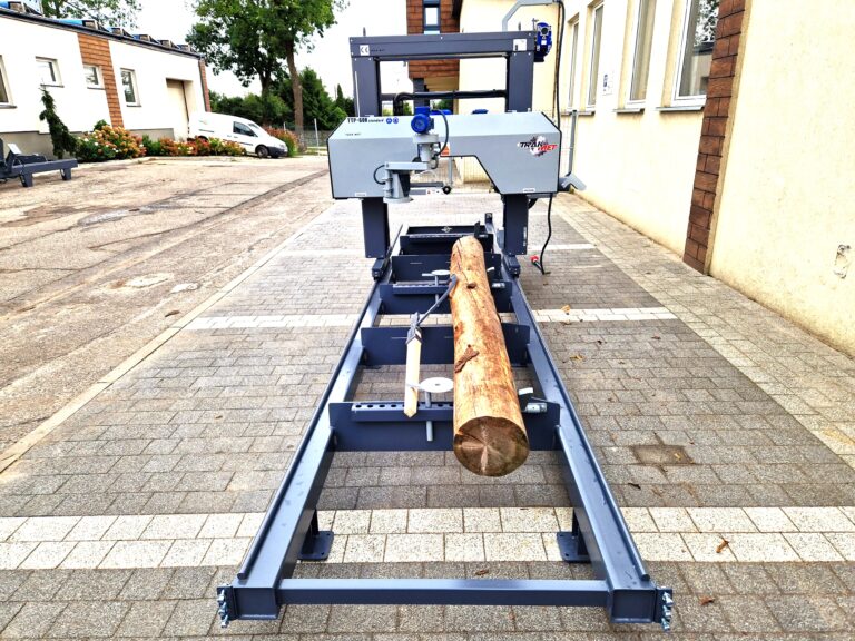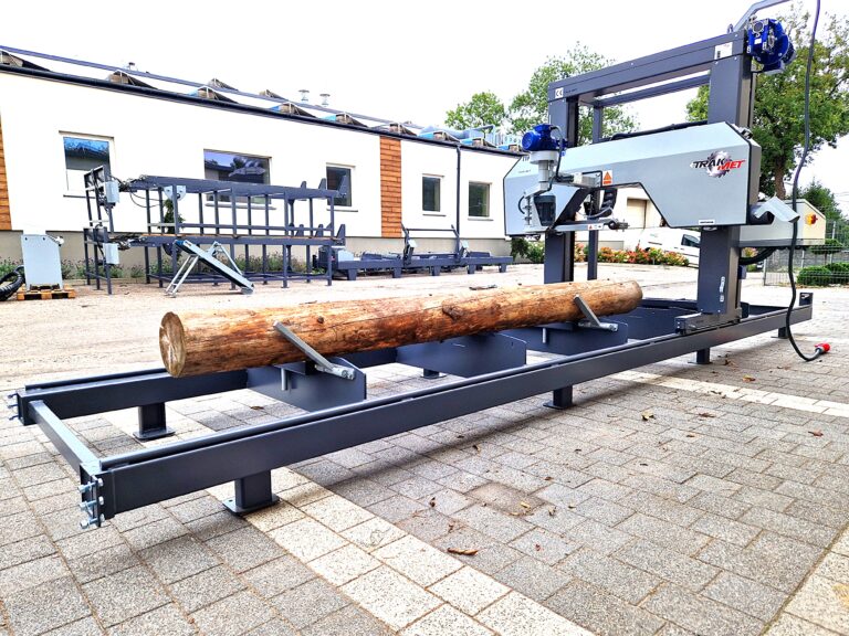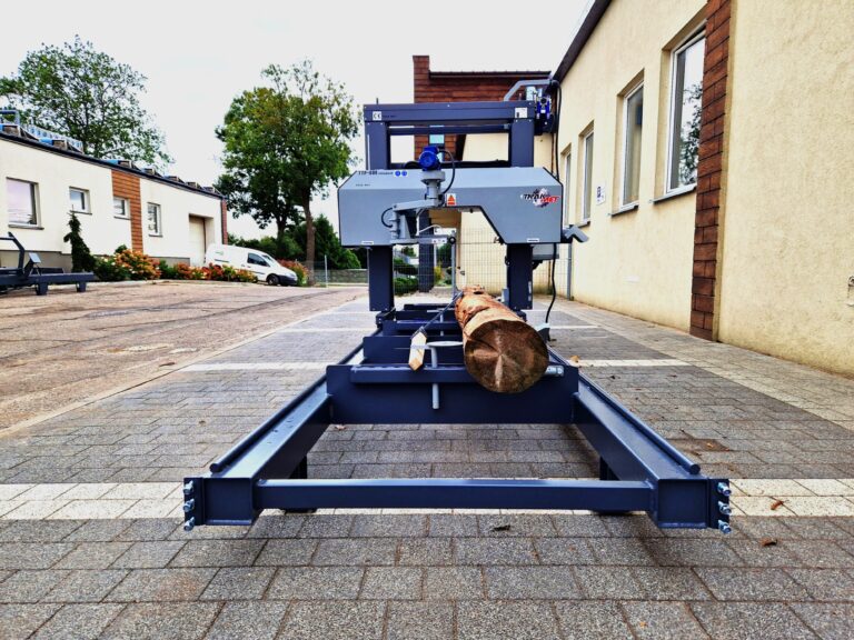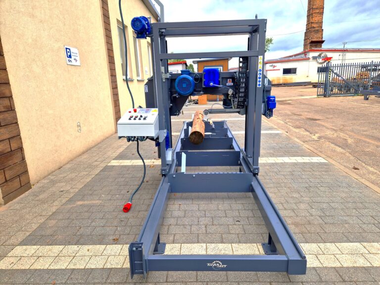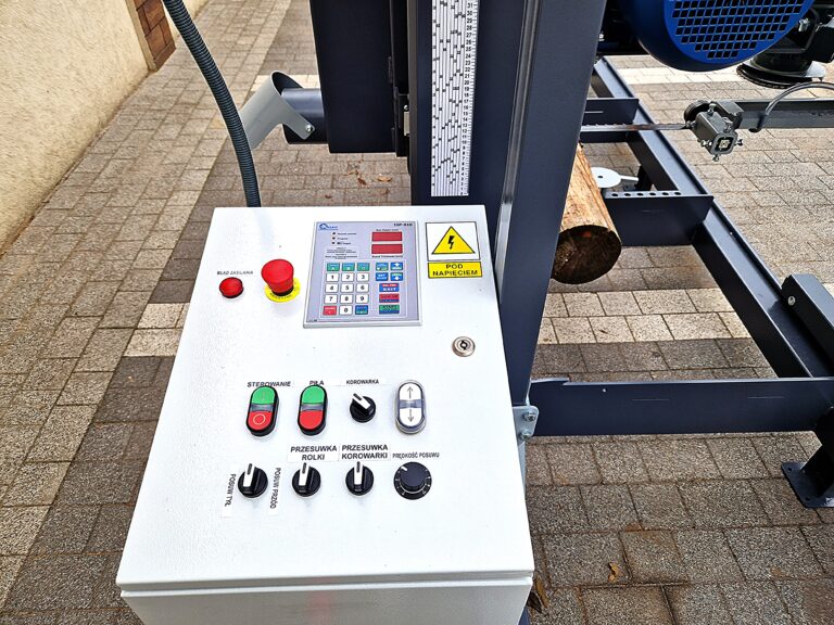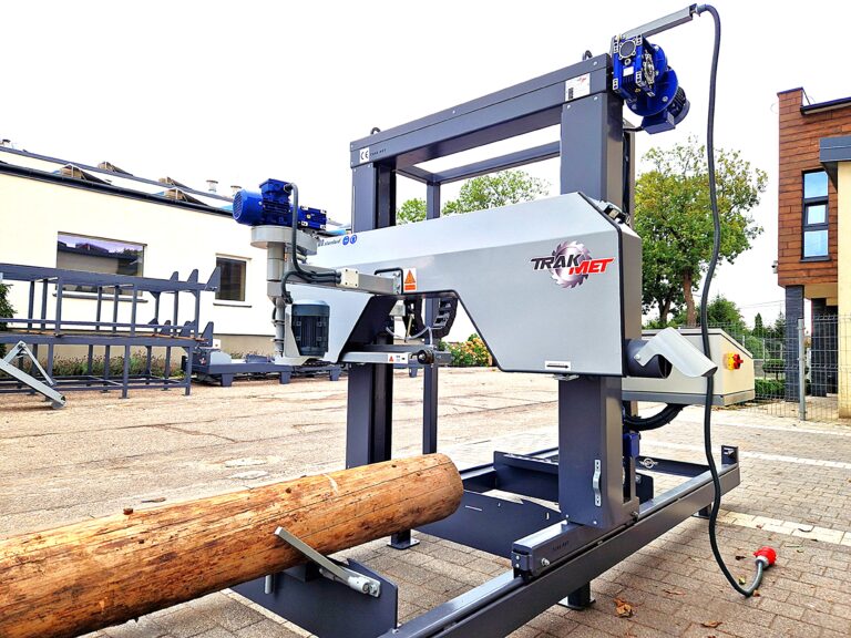 - Układ prowadzenia taśmy tnącej – koła prowadzące wyposażone w bieżnię z pasem wielorowkowym PK, który eliminuje możliwość dostania się trocin i żywicy pomiędzy pas a koło. Rozwiązanie to zwiększa stabilność pracy, redukuje drgania oraz wydłuża żywotność brzeszczotu nawet o 40%.