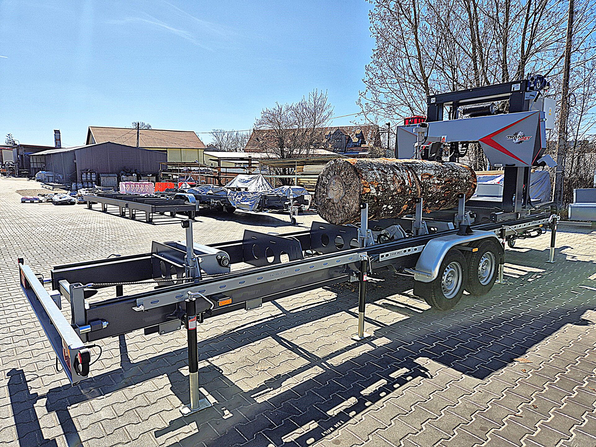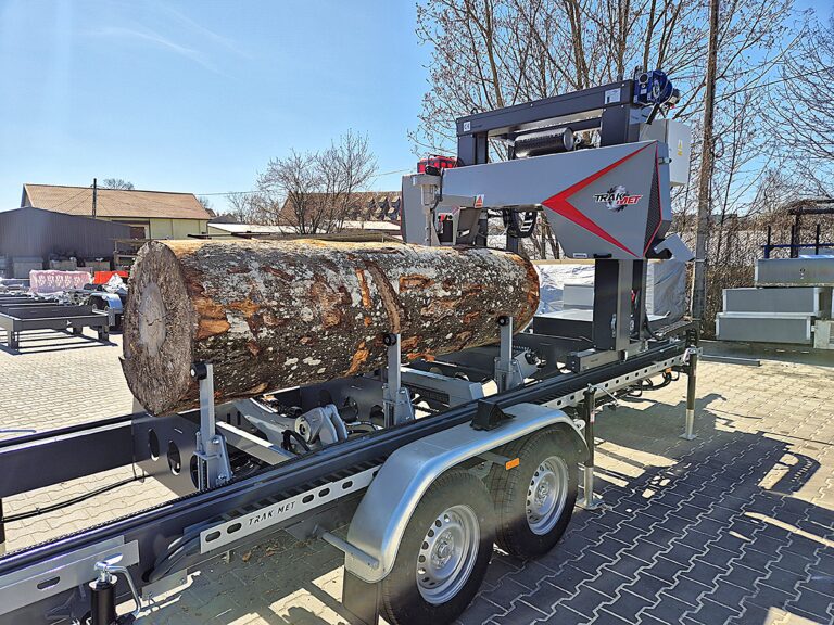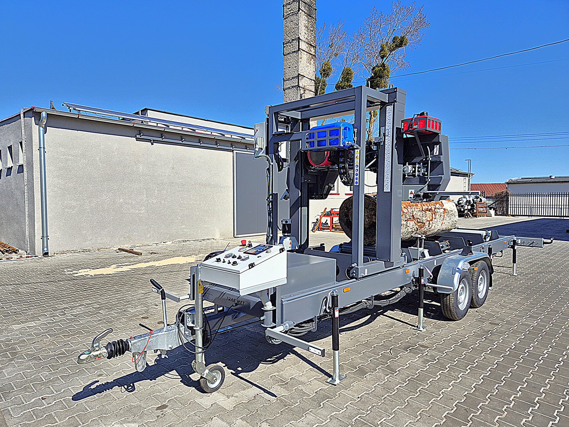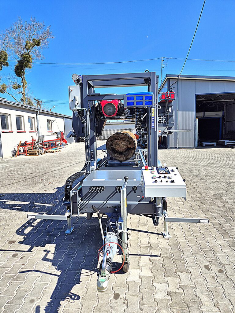 Trak Taśmowy TTP-700/MB PREMIUM PLUS w wersji mobilnej zasilany silnikiem benzynowym HONDA IGX800 to zaawansowana maszyna przeznaczona do precyzyjnego przecierania drewna kłodowego.